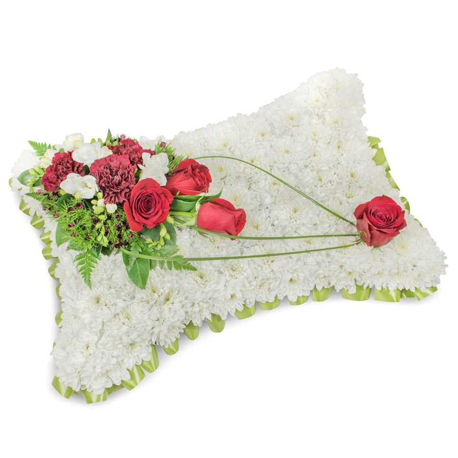 Expertly hand-crafted in Totteridge, this sympathy cushion is designed to convey sincere condolences and offer gentle support to family and friends during times of loss. Its generous size makes it ideal for placing beside the casket, on a stand or as a feature tribute at the service. Approximate dimensions: length 45cm (18"), width 60cm (24"), height 12cm (5").